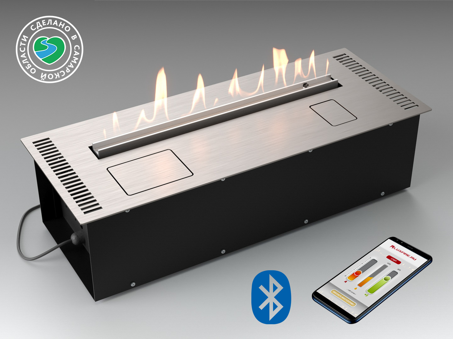 Верхняя панель автоматического биокамина (АБК) выполнена из нержавеющей стали. Для работы АБК необходимо подключение к электросети 220В. Вытяжка и дымоход не требуется, но после использования не будет лишним проветрить помещение!